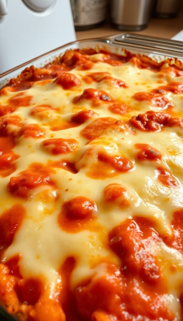 Instructions: Mix cooked pasta with sauce + cheese; bake 20 minutes.