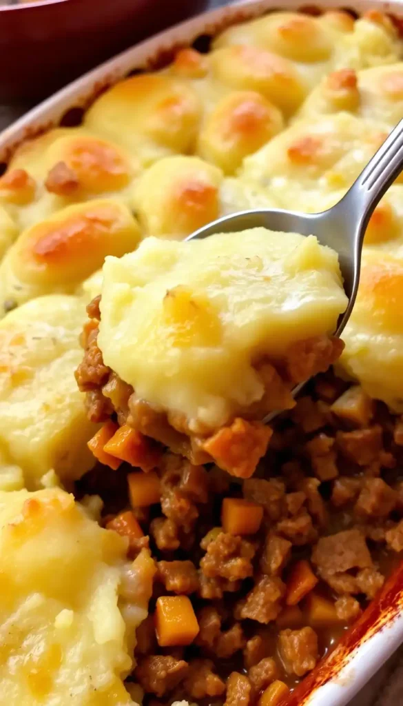 Instructions: Layer cooked beef + veggies + mashed potatoes; bake.