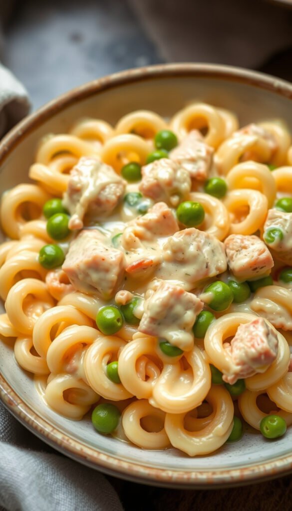 Instructions: Cook pasta, mix with tuna, peas, and cheese sauce.
