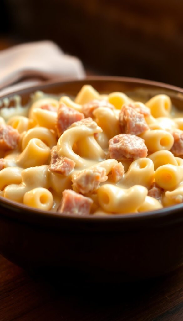 Ingredients: pasta, cheese sauce, diced ham