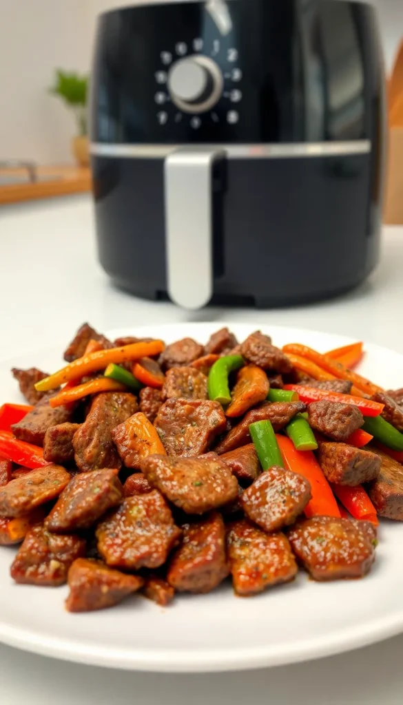 Cook beef strips in an air fryer, then toss in stir-fry sauce.