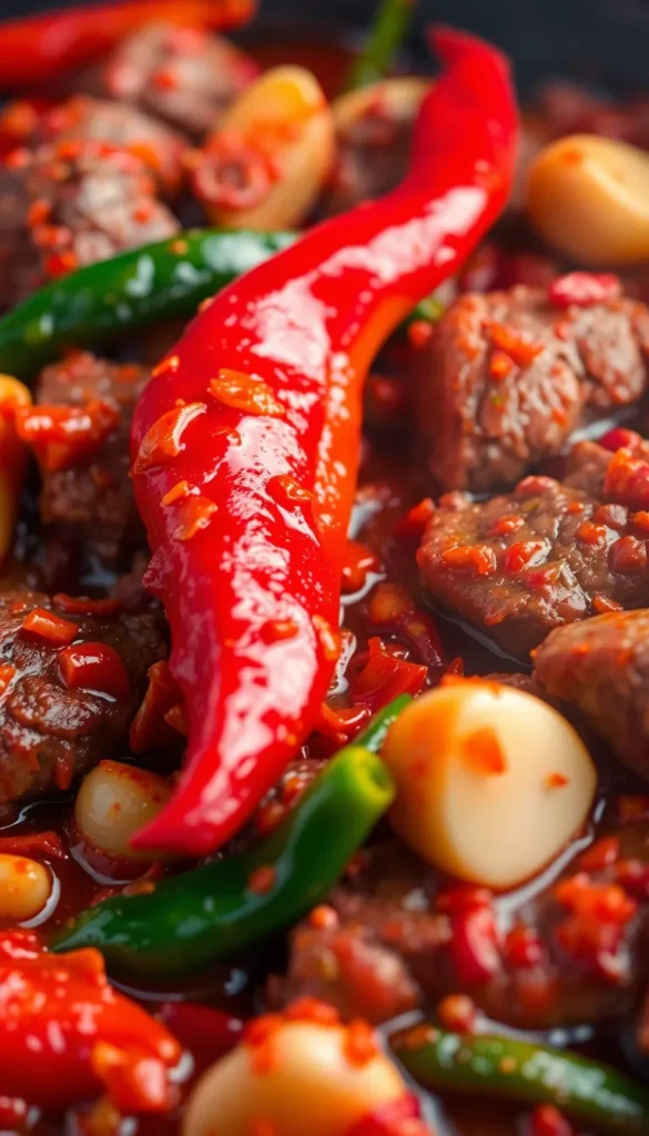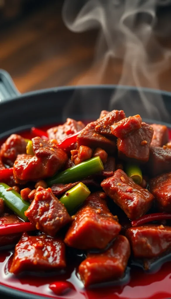 Instructions: Toast peppercorns, stir-fry with beef and peppers, finish with chili oil.