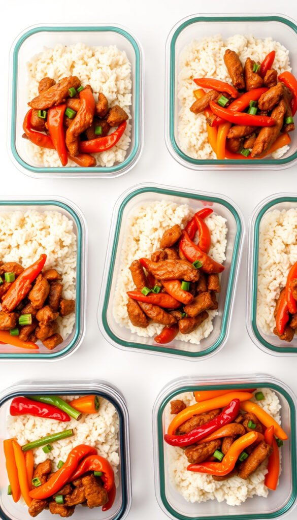 Portion beef + veggies + rice into weekly meal-prep containers.