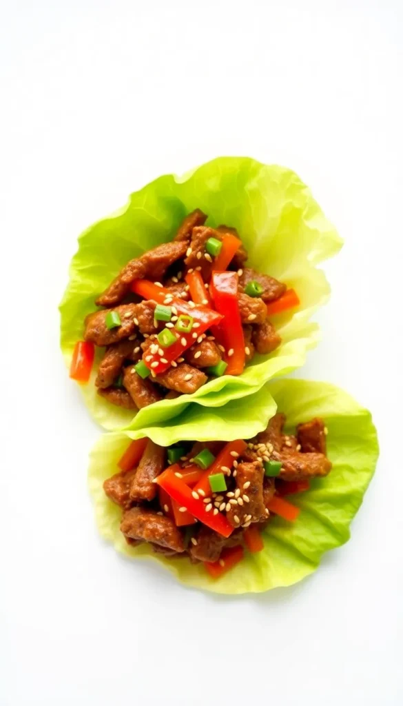 Serve cooked pepper steak inside crispy lettuce leaves.