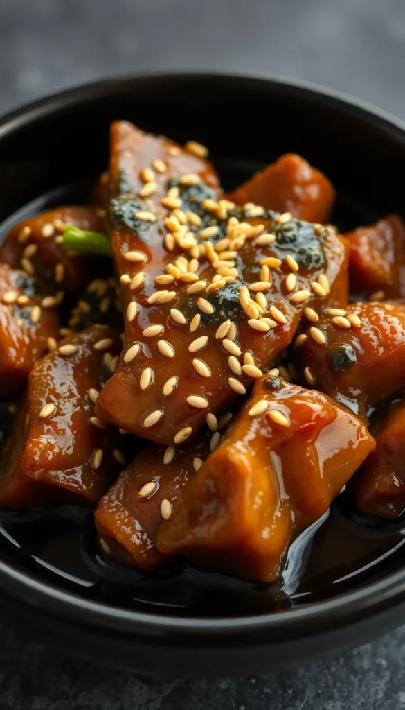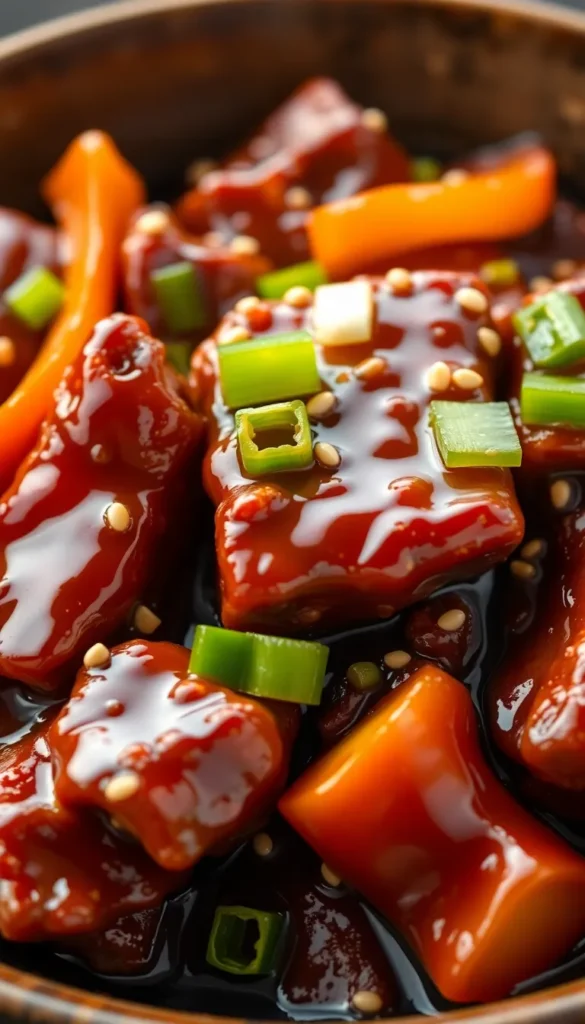Instructions: Cook beef, add garlic, honey, and soy sauce, and simmer until sticky.