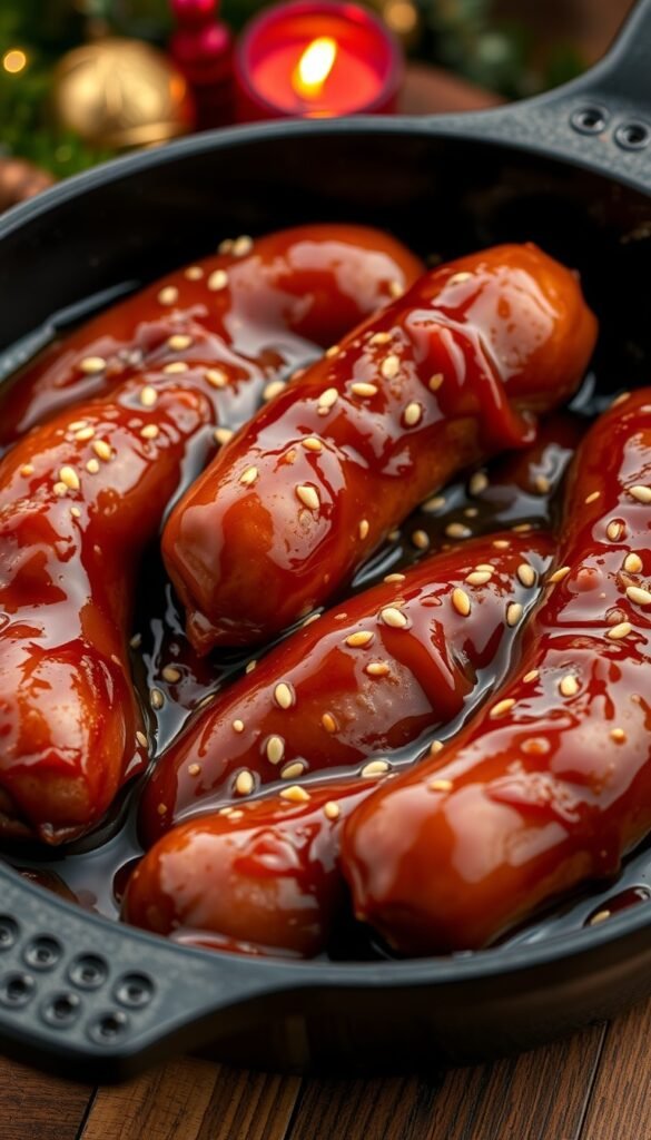 - Simmer sausages with honey, garlic, and soy until glazed.