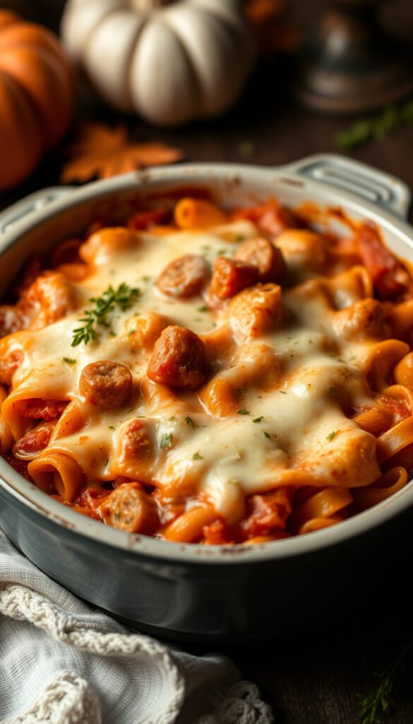 Mix cooked pasta with sauce and sausage, top with cheese, and bake for 30 minutes.
