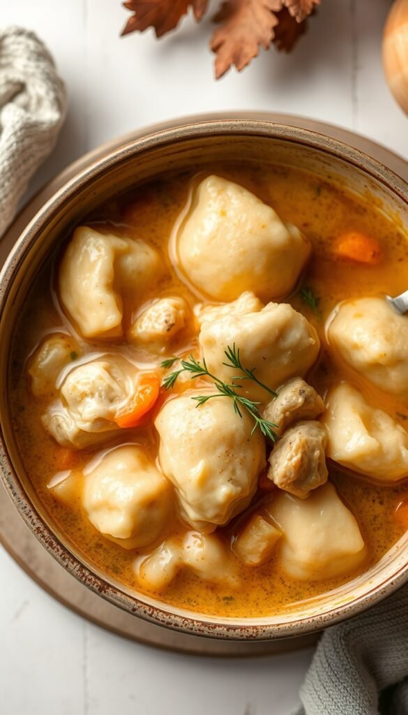 Simmer chicken, drop dumplings, and cook until fluffy.
