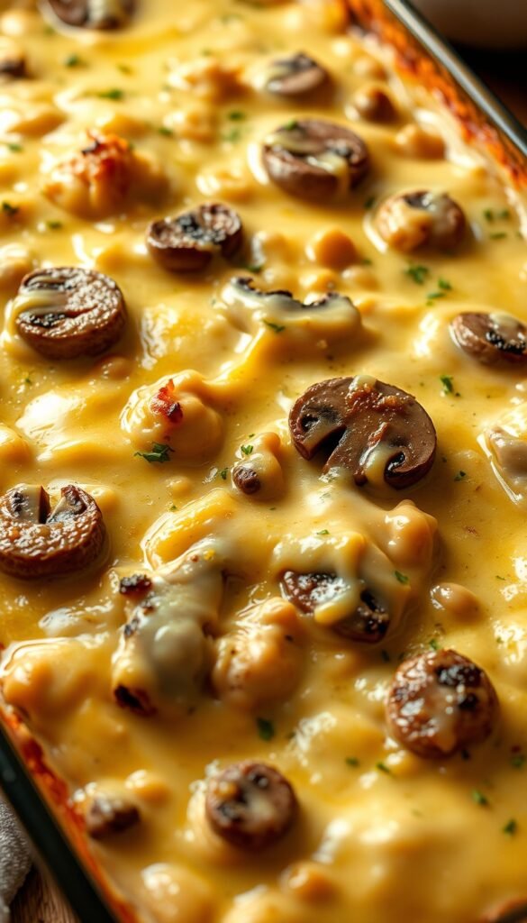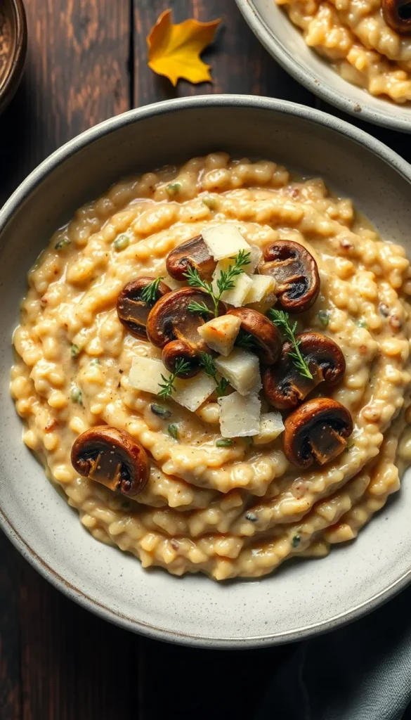 Slowly add warm broth to the sautéed rice while stirring. Add mushrooms and cheese until creamy.