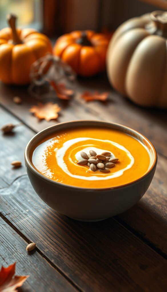 Pumpkin puree, onion, garlic, vegetable broth, cream, olive oil, salt, pepper