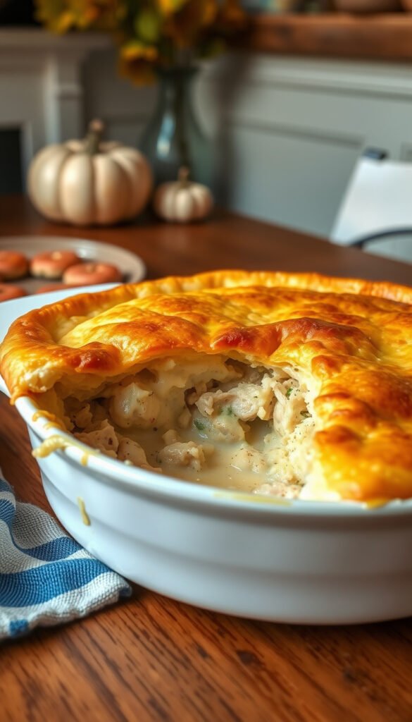 Make a creamy filling with butter, flour, and cream. Add chicken and veggies. Pour into crust, cover, and bake at 375°F (190°C) for 40 minutes.