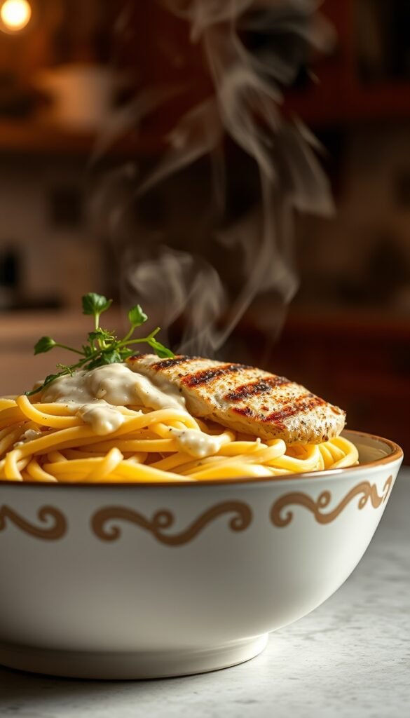 Cook chicken, prepare creamy sauce, and toss with pasta.