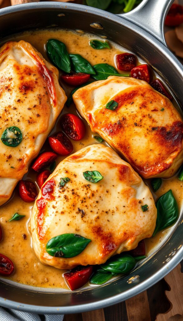 Pan-sear chicken, simmer in creamy sauce with tomatoes and spinach.