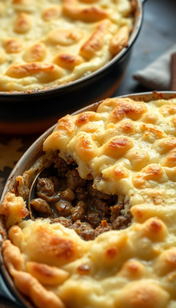 Cook beef with veggies, top with mashed potatoes, and bake until golden.