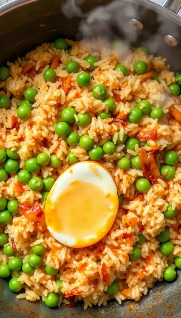 Scramble egg, add rice, peas, soy sauce, stir-fry.