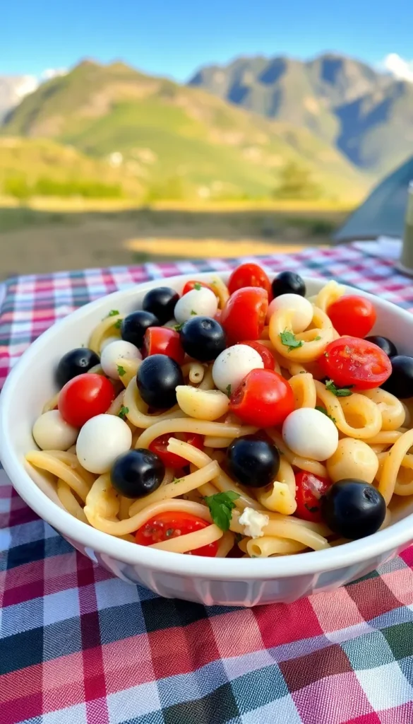 Cook pasta at home and toss with veggies, olives, mozzarella, olive oil, and herbs.