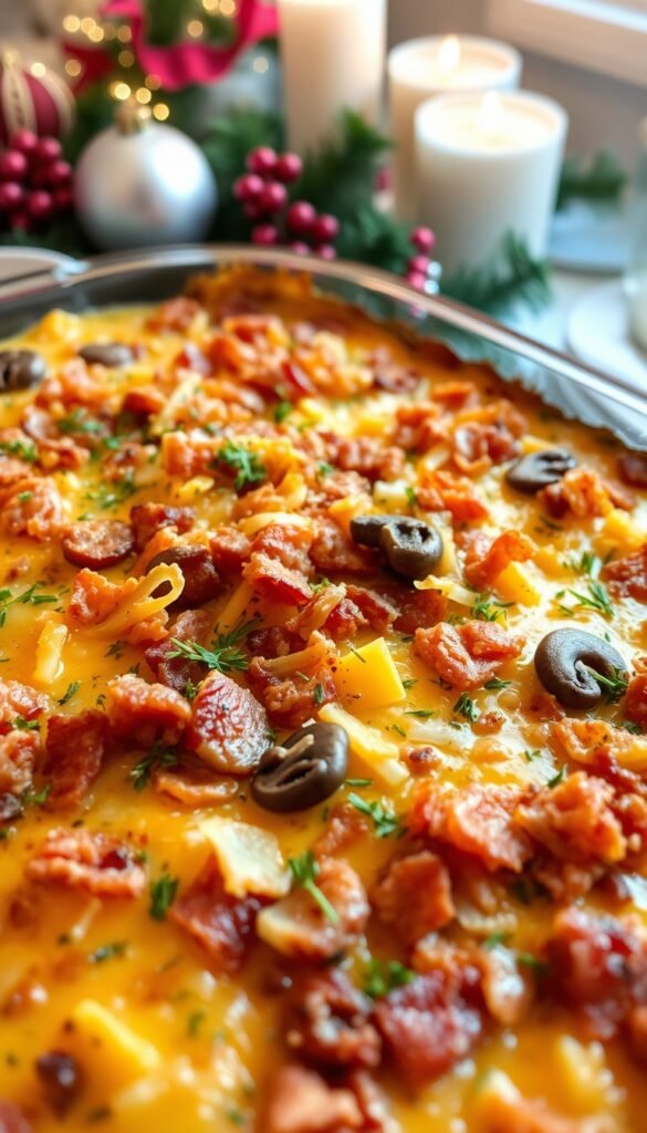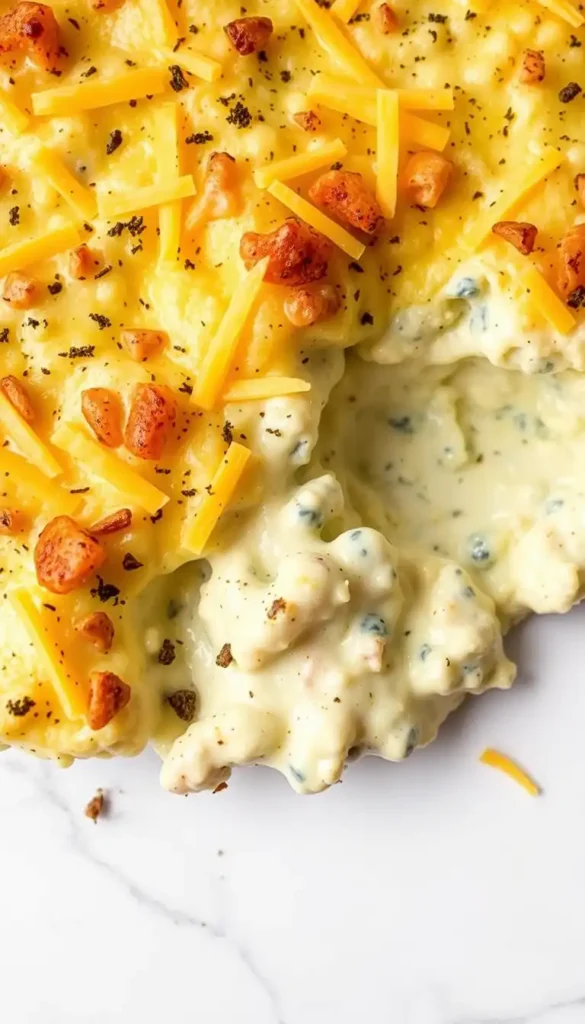 Add 1 cup shredded cheddar into the classic mixture before baking. Top with extra cheese plus fried onions.