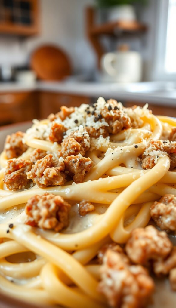 Ingredients: Ground sausage, pasta, heavy cream, parmesan, garlic
