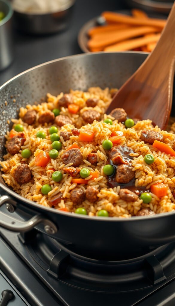 Ingredients: Ground sausage, cooked rice, eggs, peas, soy sauce