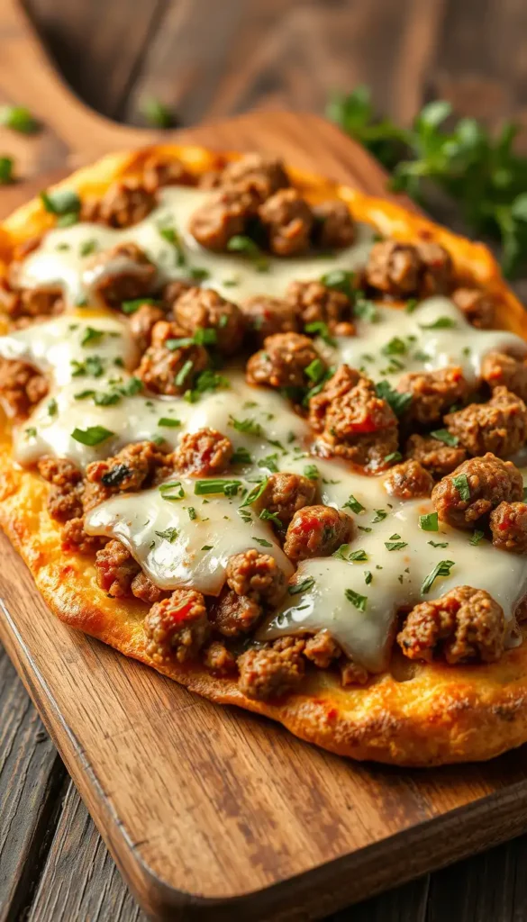 Ingredients: Ground sausage, flatbread, cheese