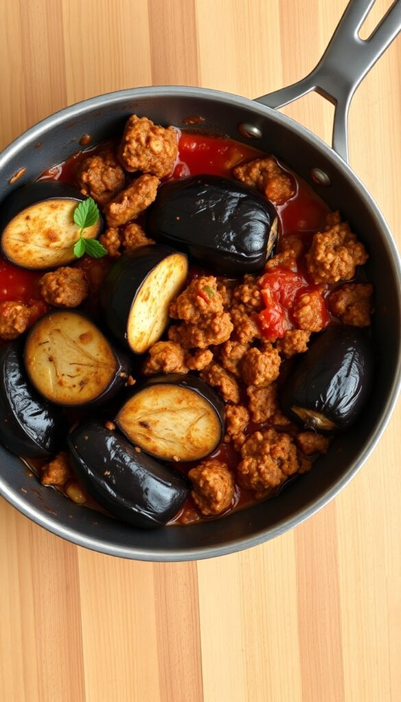 Ingredients: Ground sausage, eggplant, tomato sauce