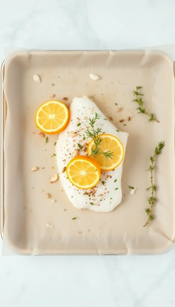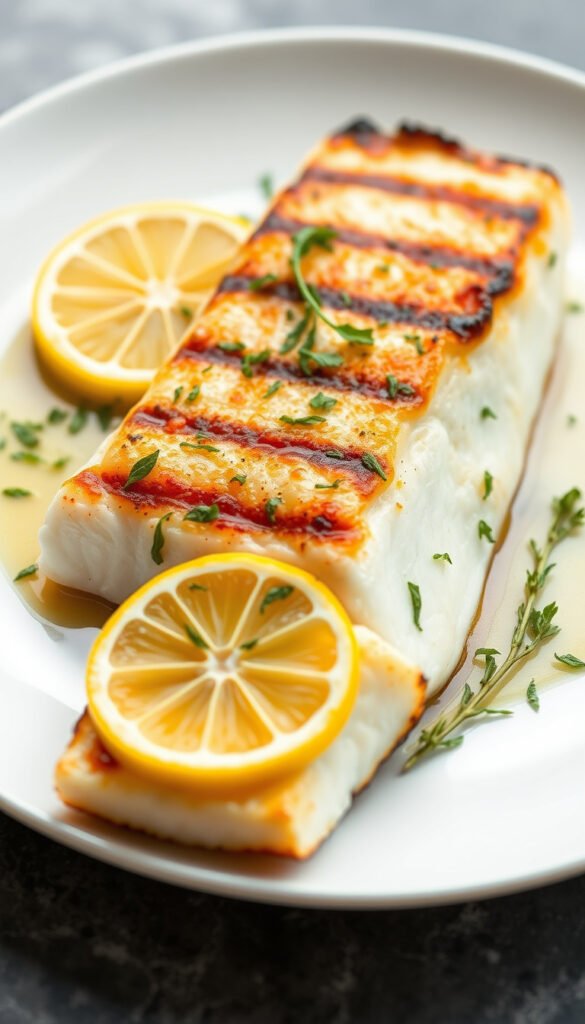 Ingredients: Halibut, lemon, garlic, and herbs.