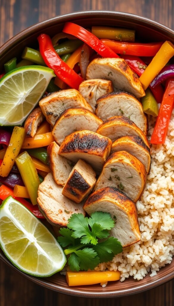 Ingredients: Chicken breast, peppers, onions, spices, rice.
