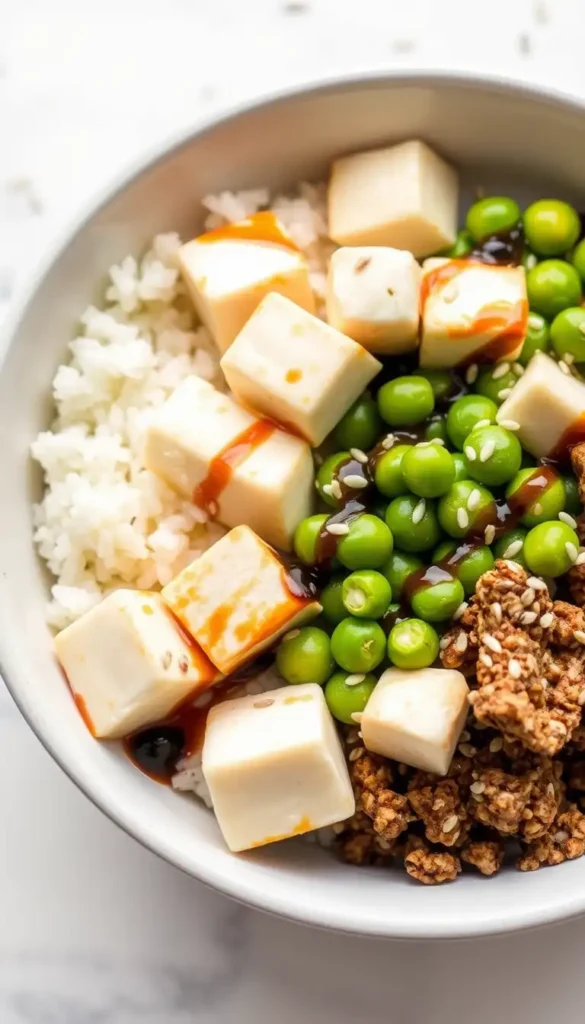 Ingredients: Tofu, edamame, rice, soy sauce.