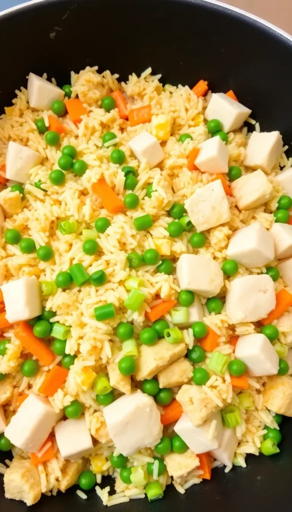 Instructions: Stir-fry eggs + chicken; add rice + sauce.