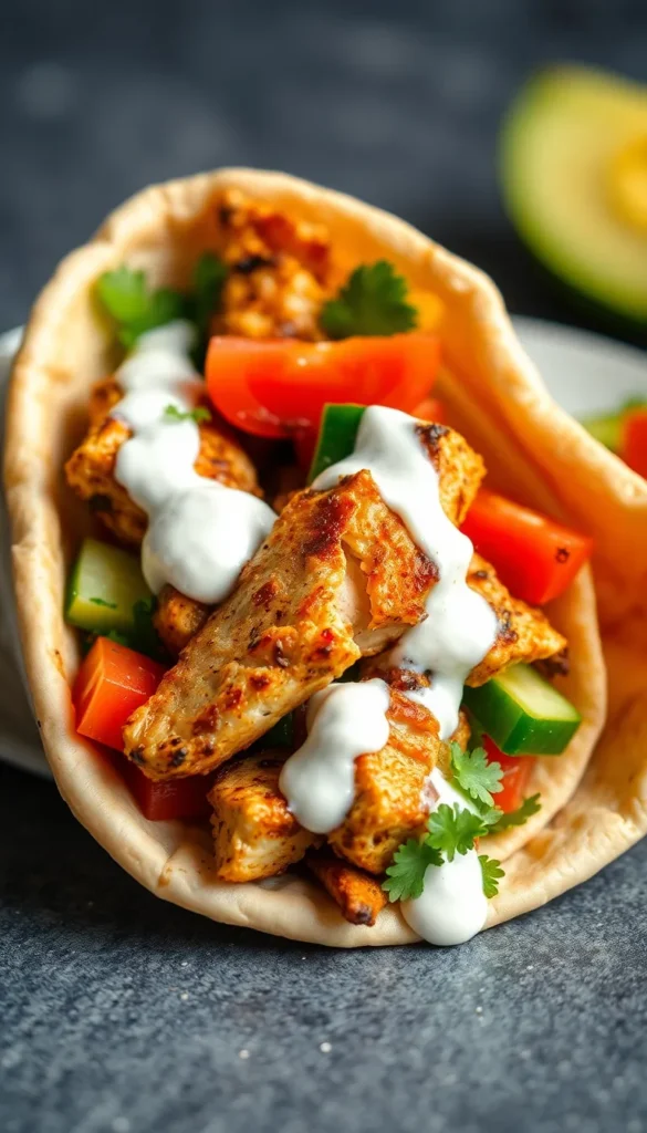 Ingredients: Chicken, pita, tzatziki, cucumber, and tomatoes.