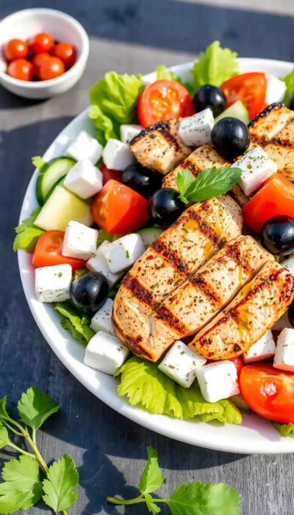 Ingredients: Chicken, feta, cucumber, tomatoes, olives.