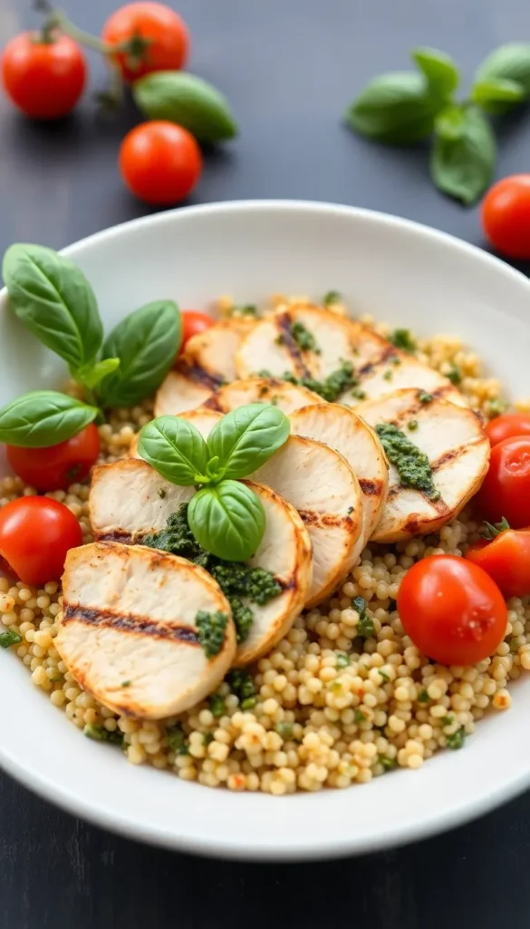Ingredients: Chicken, quinoa, pesto, cherry tomatoes.