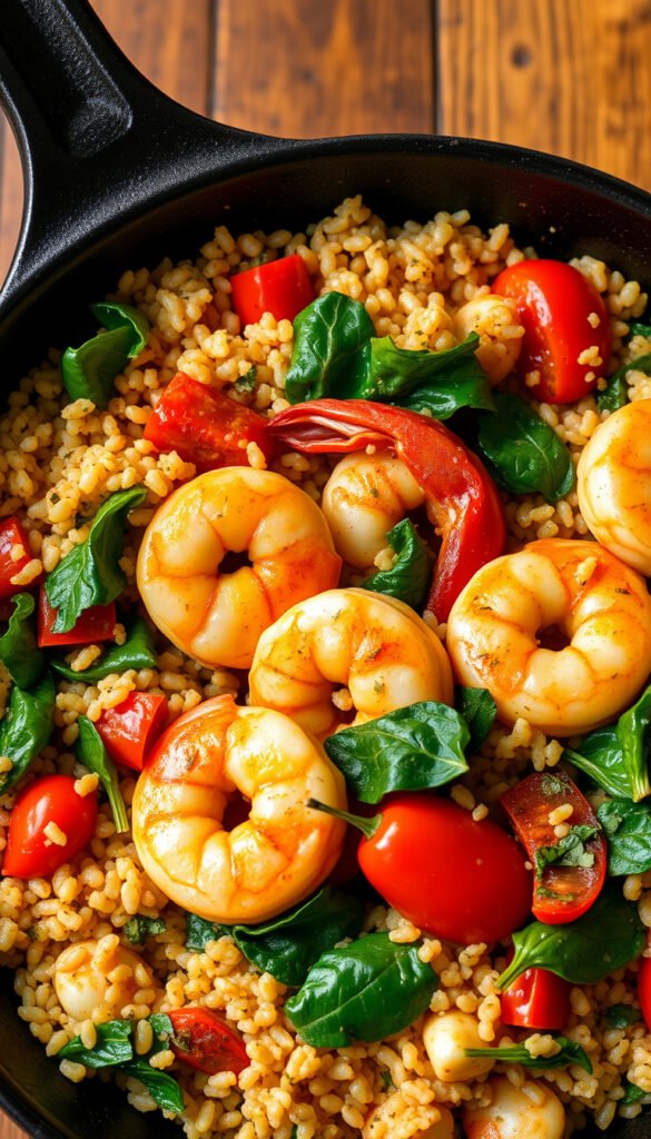 Ingredients: Shrimp, quinoa, tomatoes, spinach.