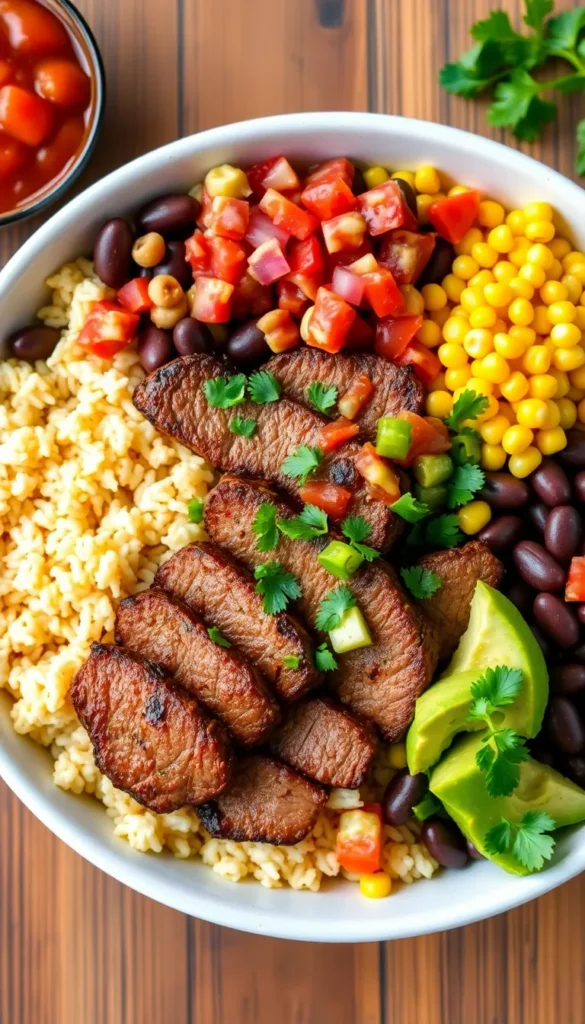 Ingredients: Steak, rice, avocado, beans, and salsa.