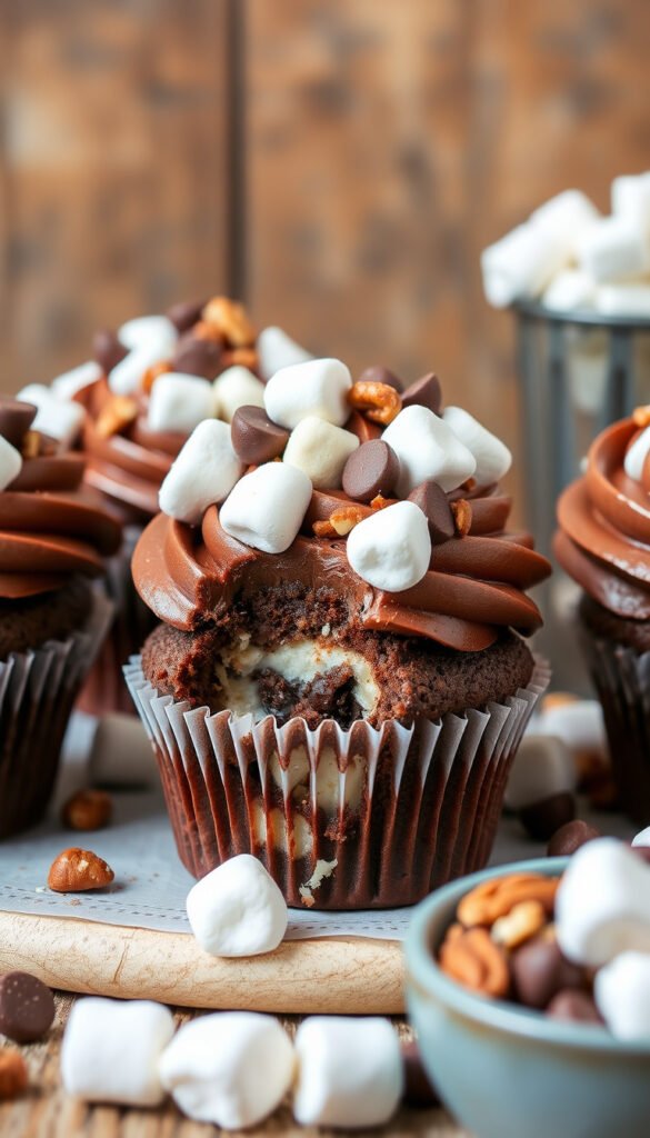 Ingredients: Cocoa powder, mini marshmallows, chopped nuts, chocolate chips, flour, sugar, eggs, butter