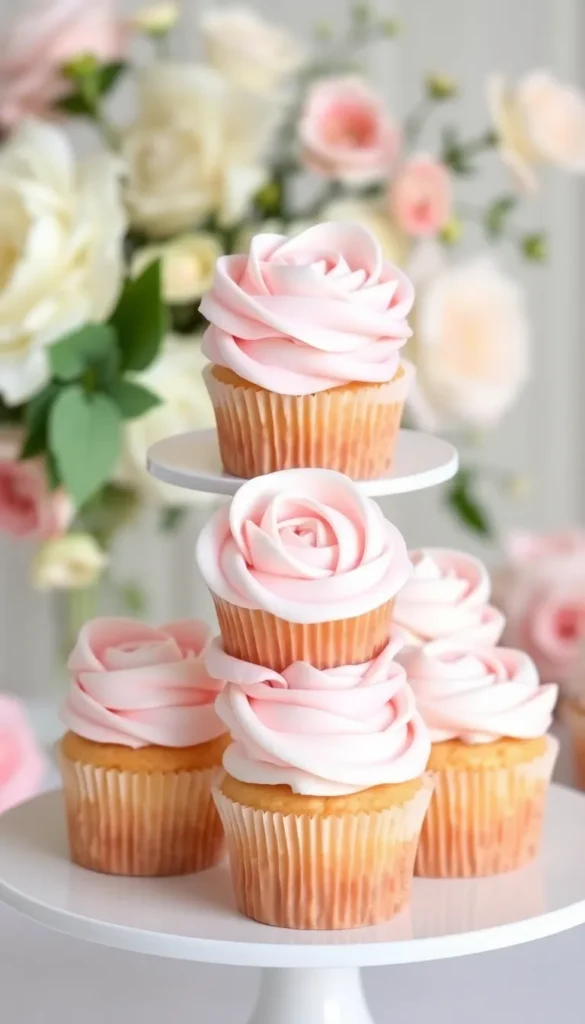 Vanilla cupcakes with rosewater buttercream frosting piped like roses