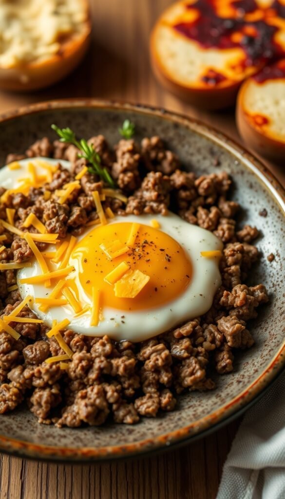 Ground beef, eggs, and cheddar