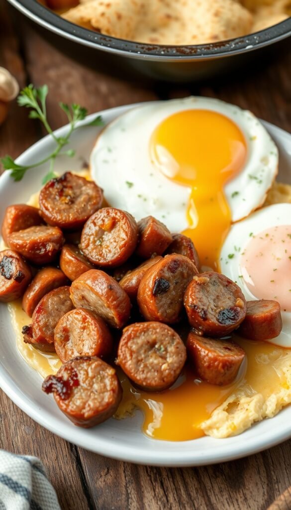 Pork sausage, eggs, cream, cheese