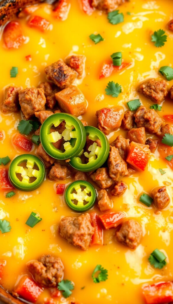 Ground beef, eggs, cheese, jalapeños