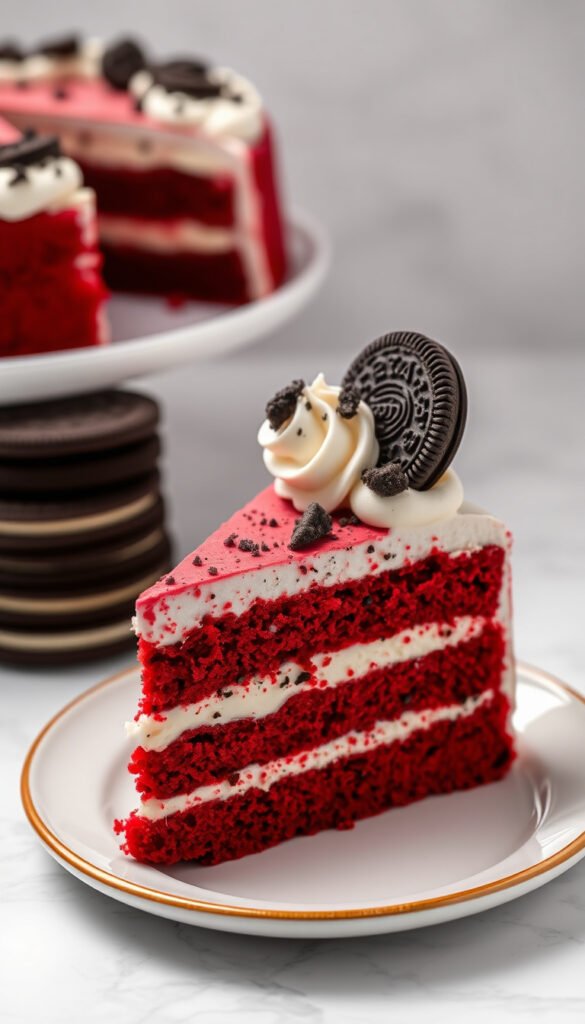Add 1 tbsp cocoa powder and red gel coloring to the cake; use Red Velvet Oreos.