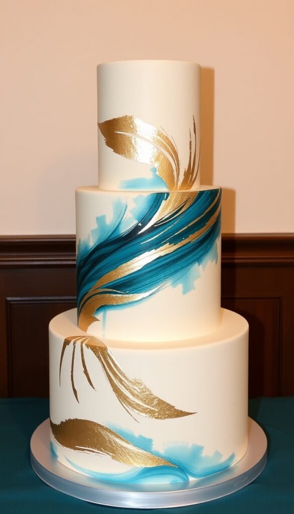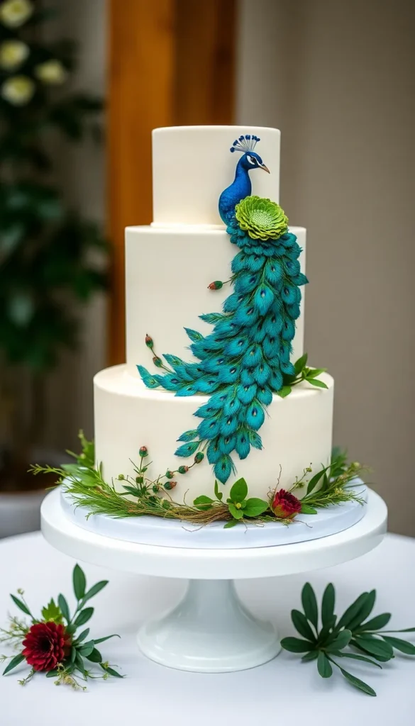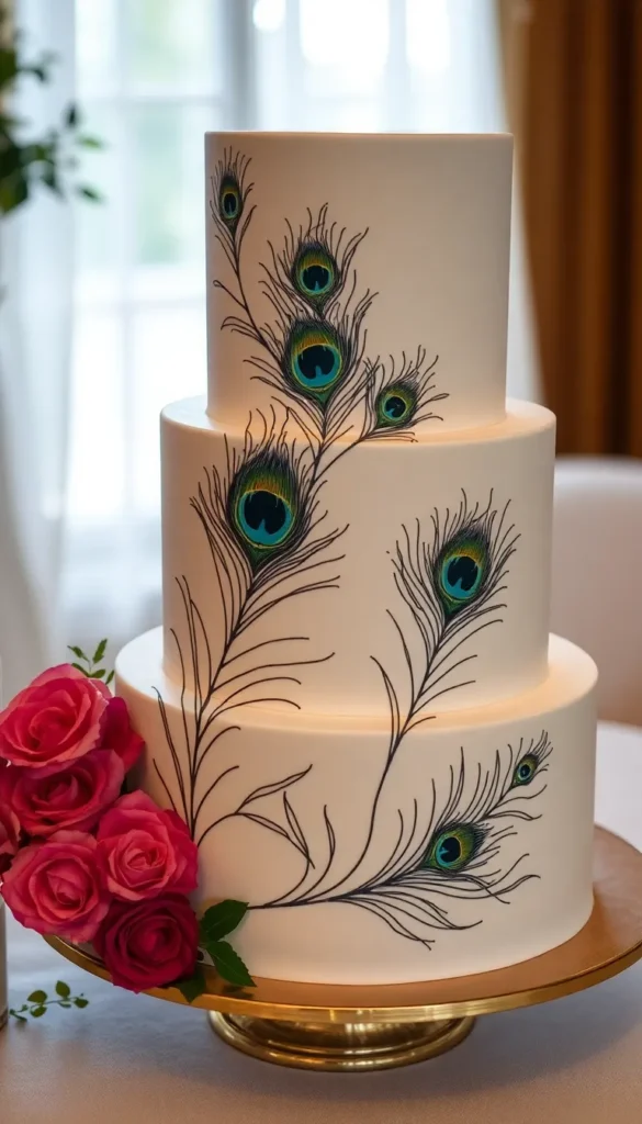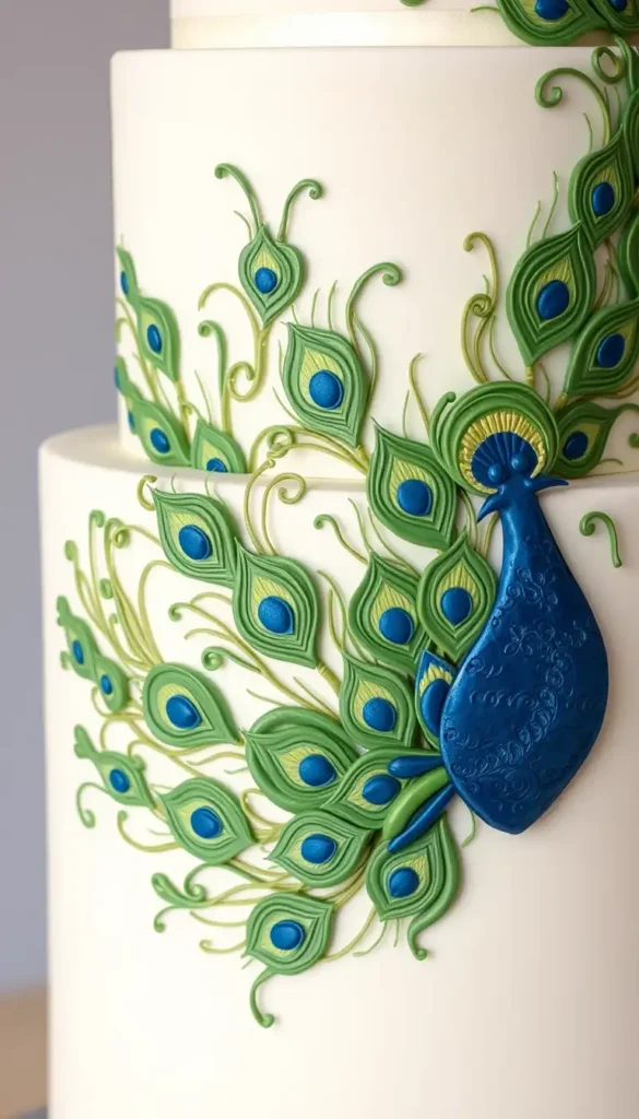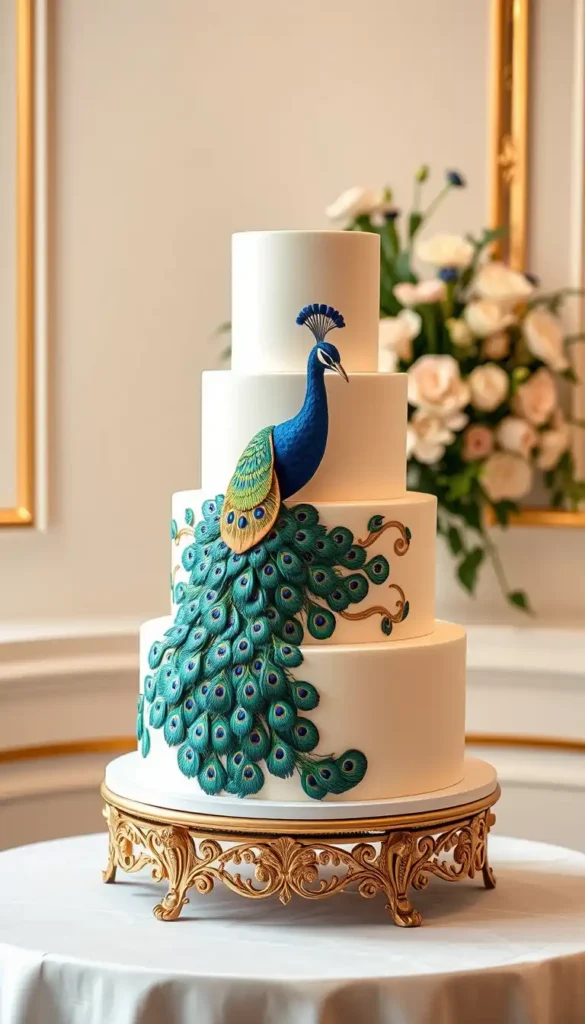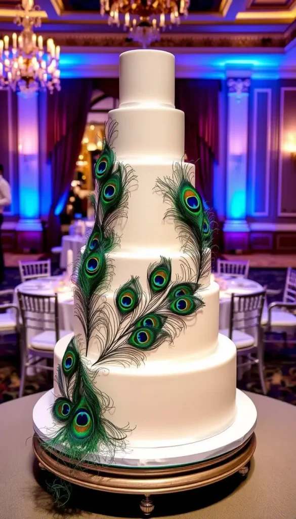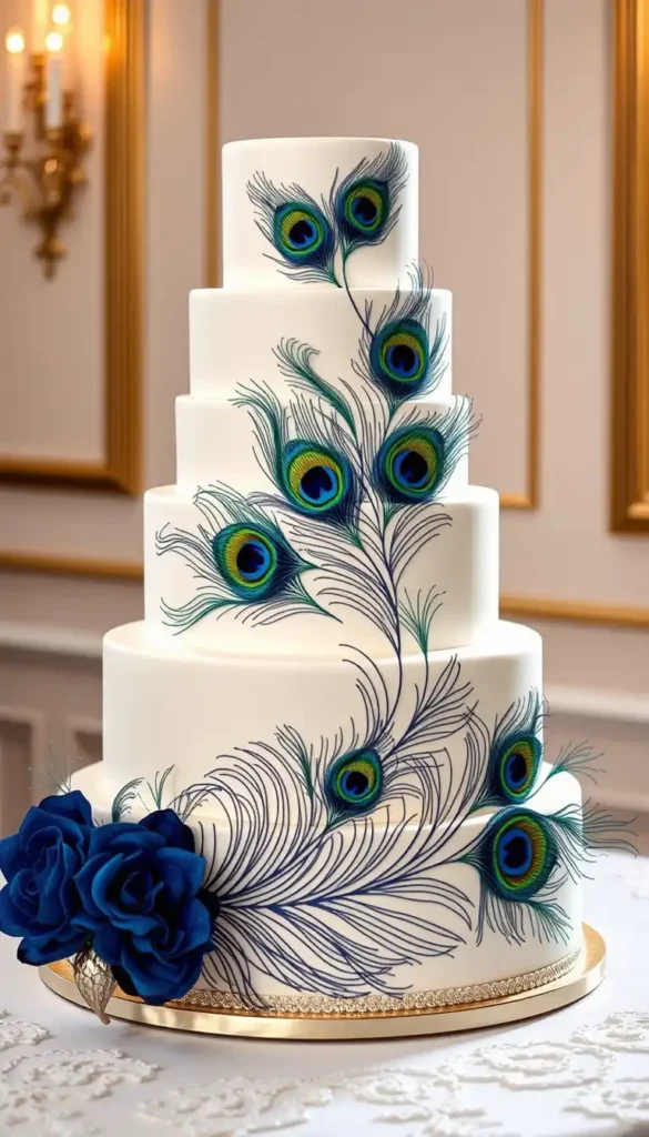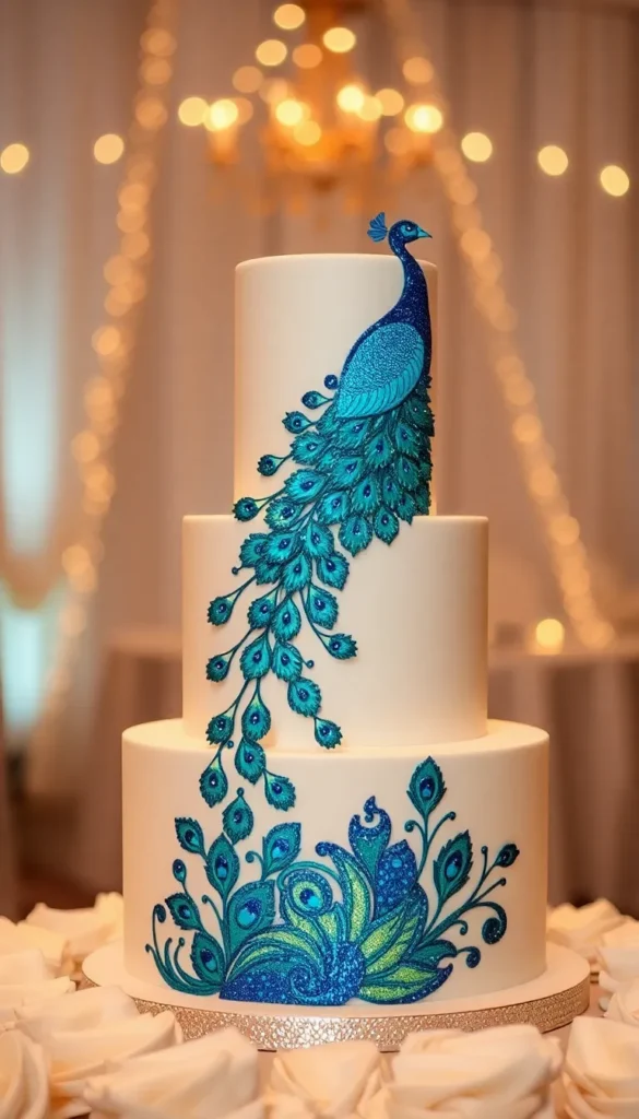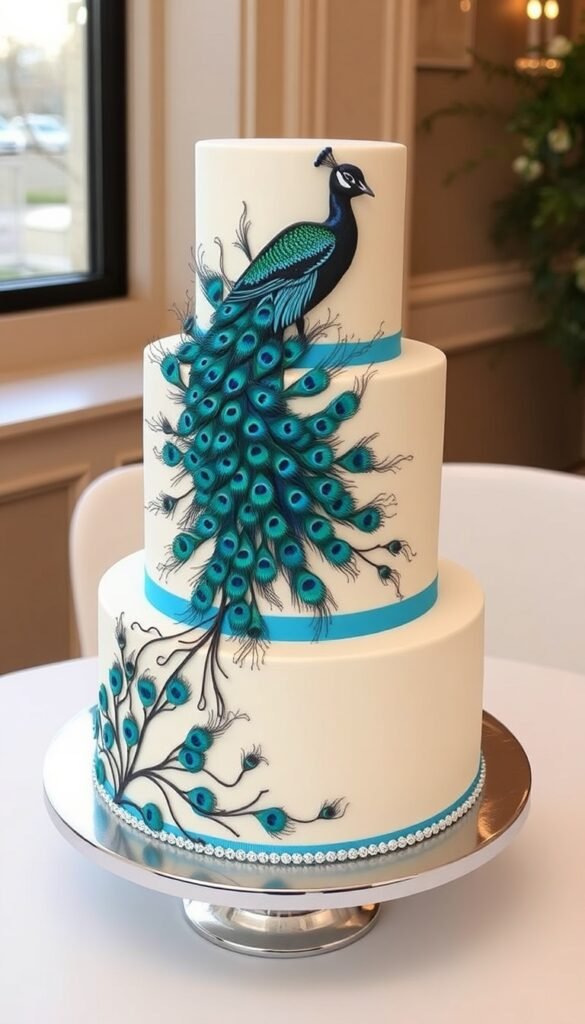 Each tier is hand-painted with realistic peacock feather designs, making the cake look like a piece of fine art.
