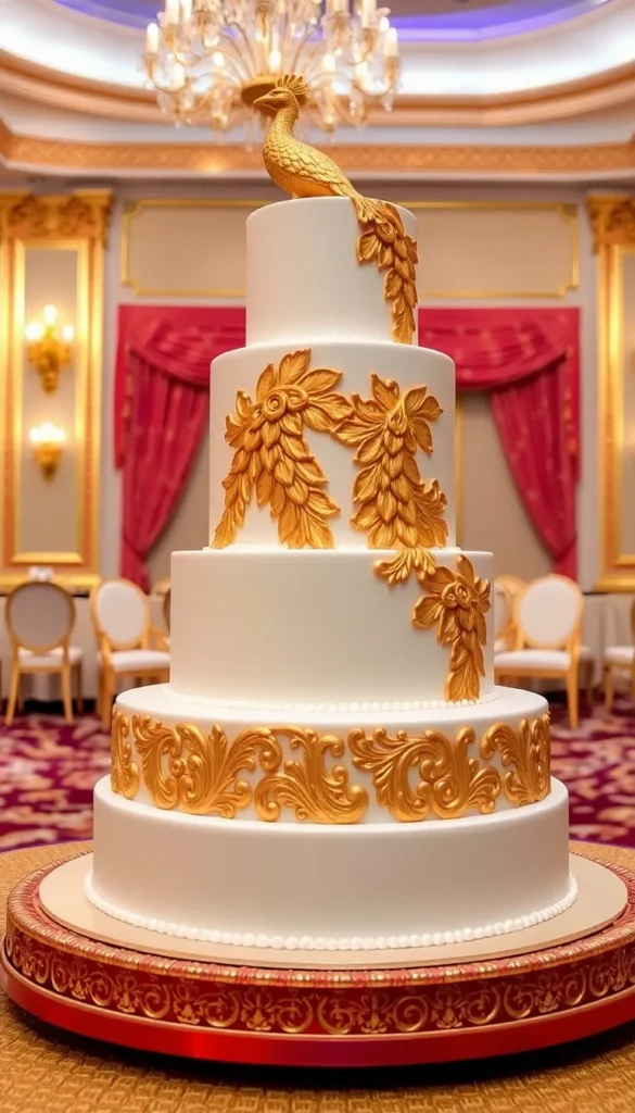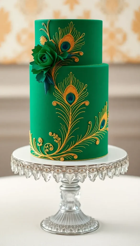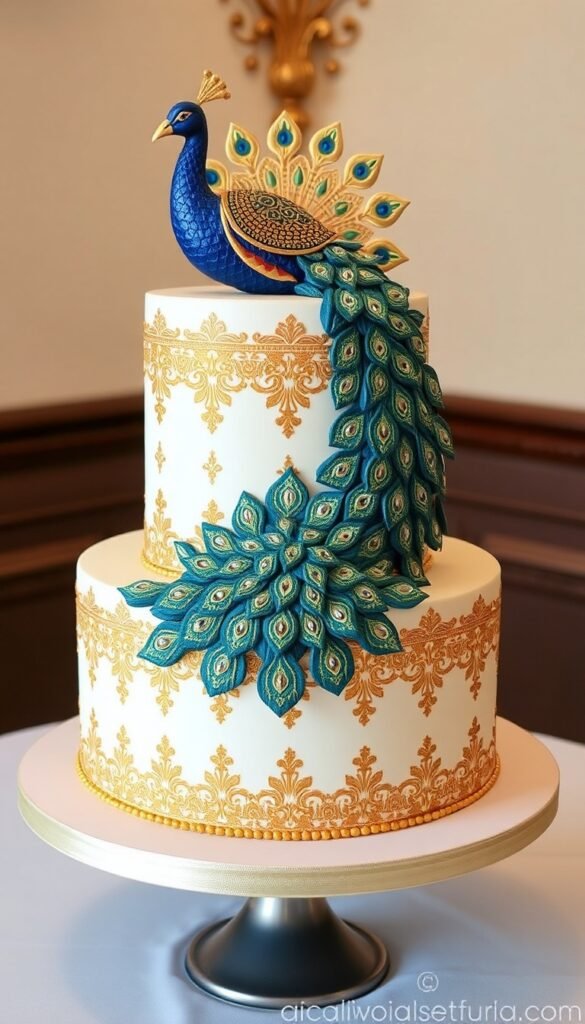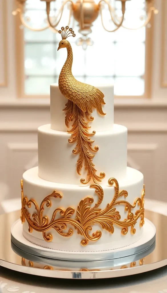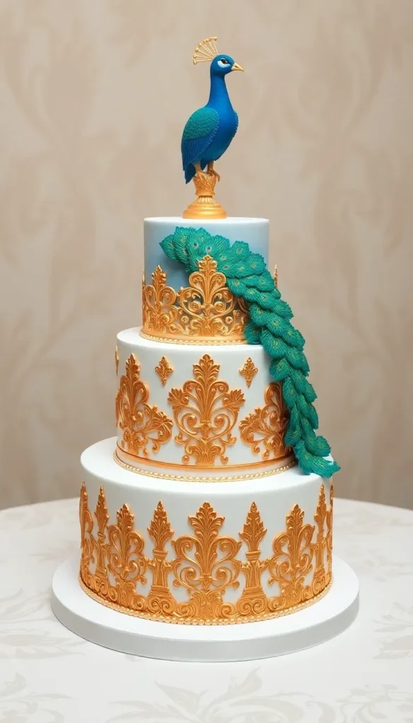 Gold-embossed peacock patterns give this cake a bold and royal finish.