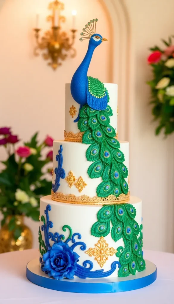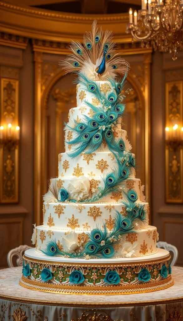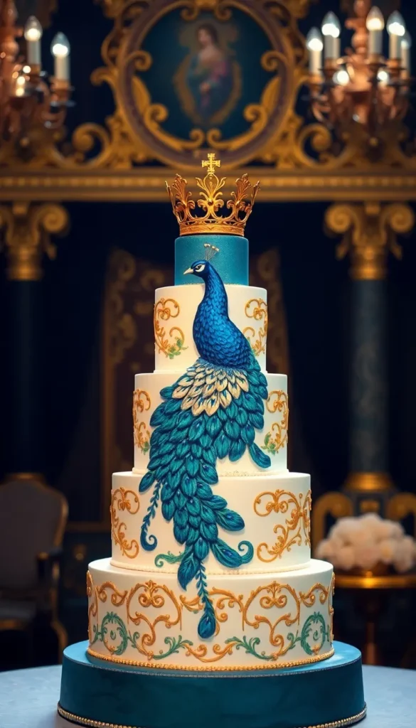 A majestic peacock cake topped with a gold crown, ideal for royal or palace-style weddings.