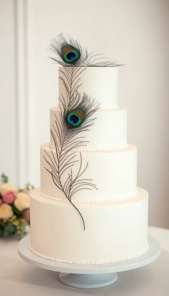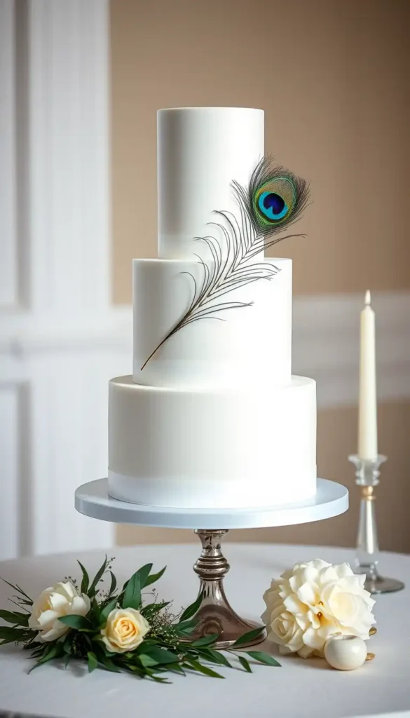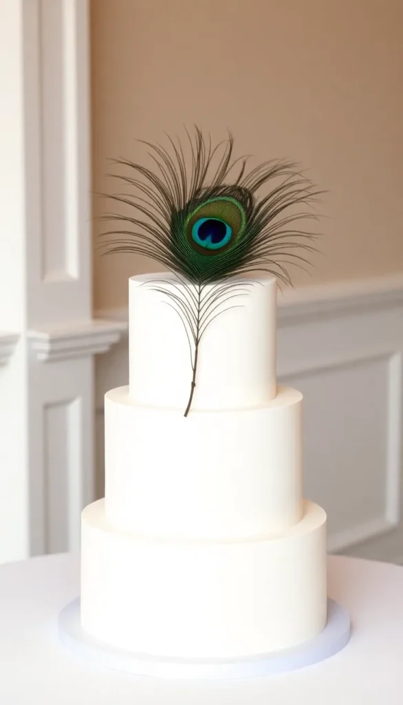 A simple white cake with peacock feather accents for couples who prefer elegance with a touch of color.