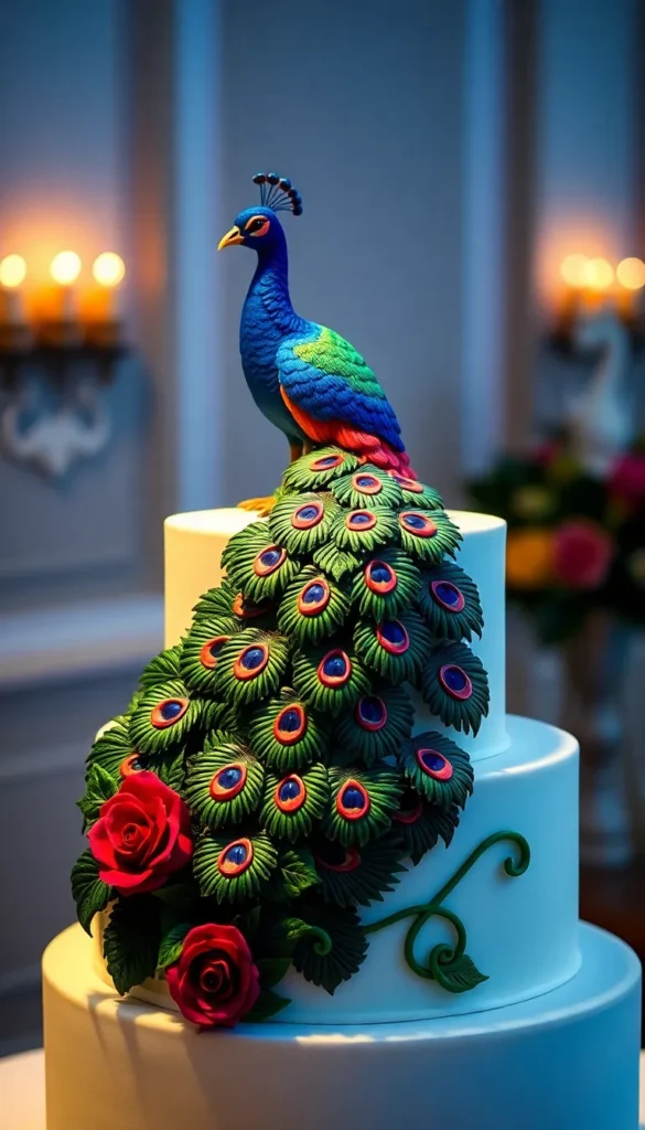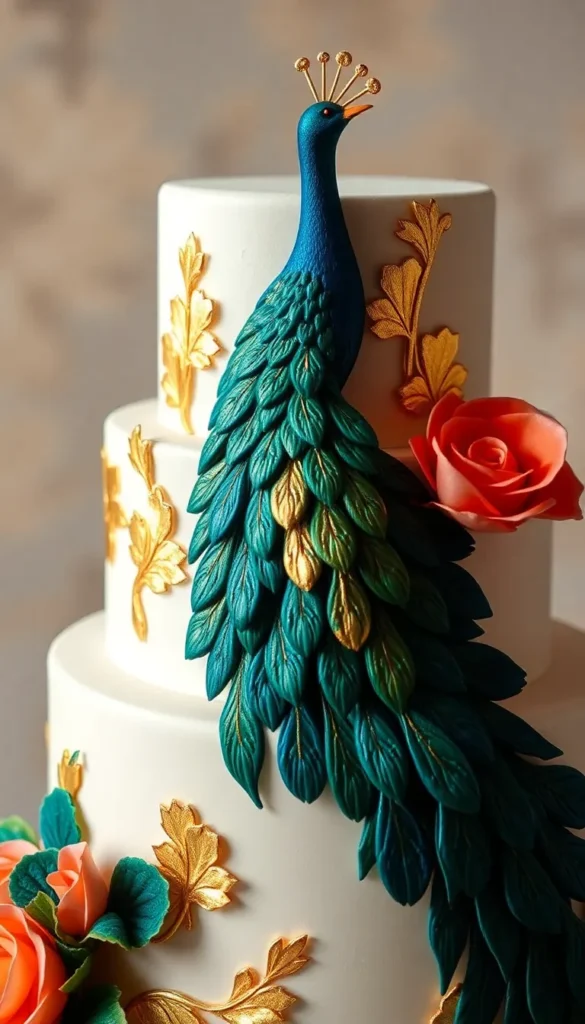 A realistic 3D sugar peacock perched on the cake steals the spotlight.