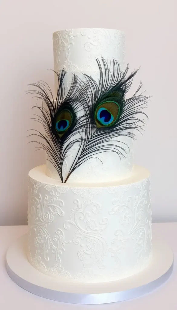 White lace patterns with peacock feathers placed delicately around the tiers add softness and romance.