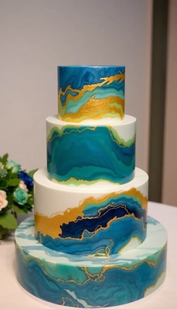 Blue and green marble fondant creates a luxurious stone-like appearance.