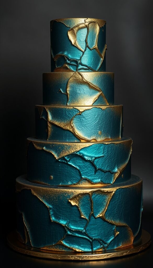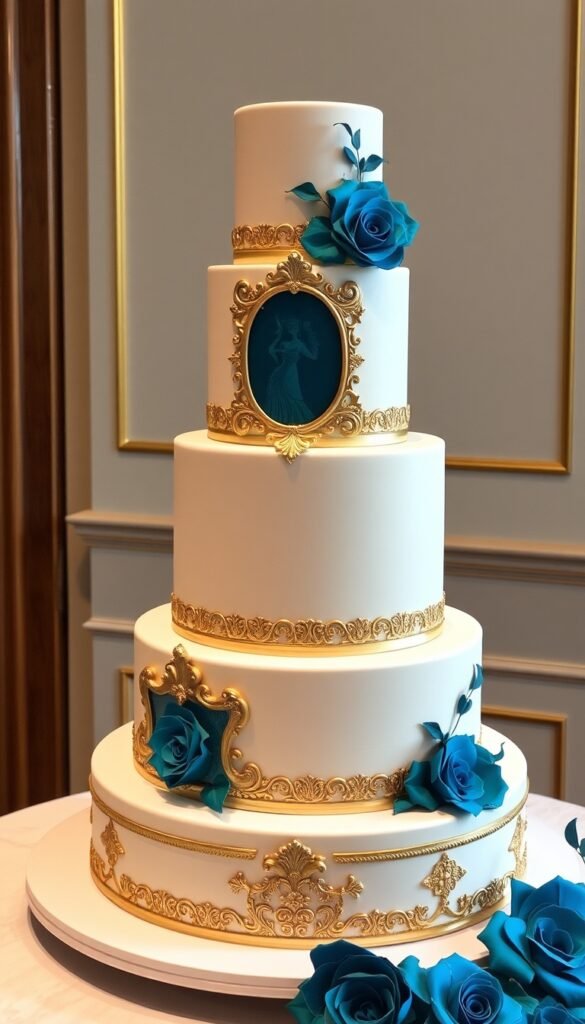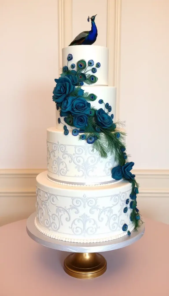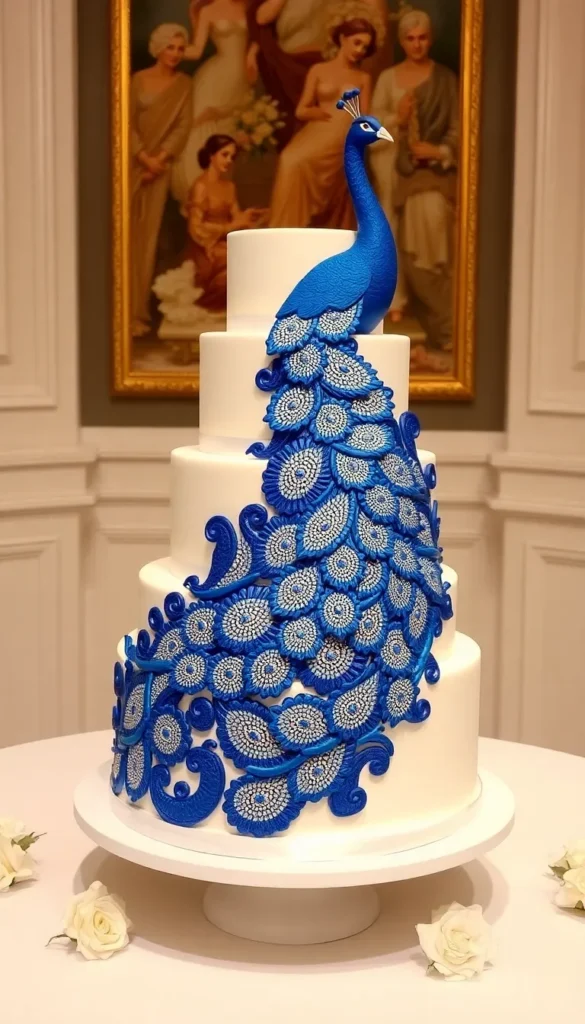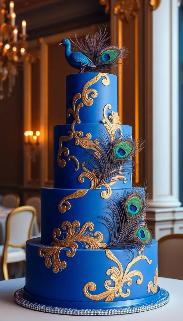 This cake features deep royal blue tiers with gold accents and sugar peacock feathers, symbolizing luxury and grandeur.