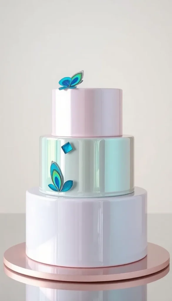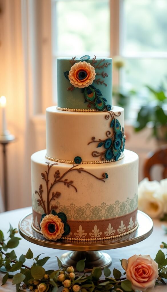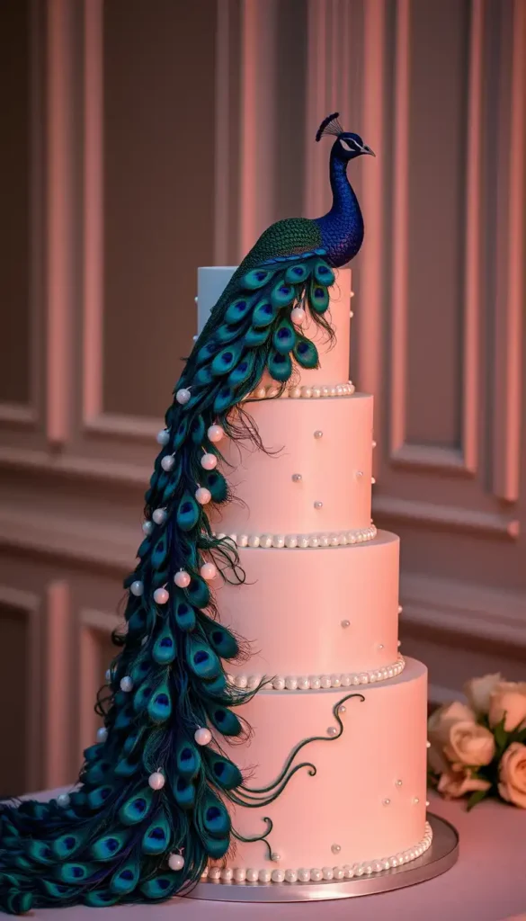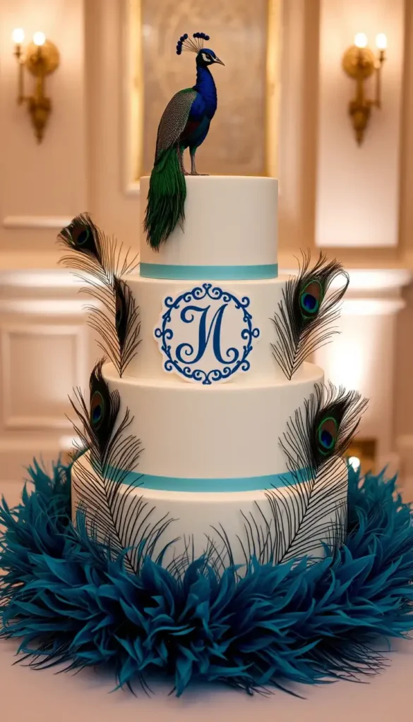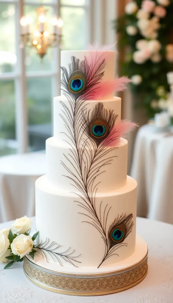 55. Peacock Wedding Cake with Soft Pastel Feathers
