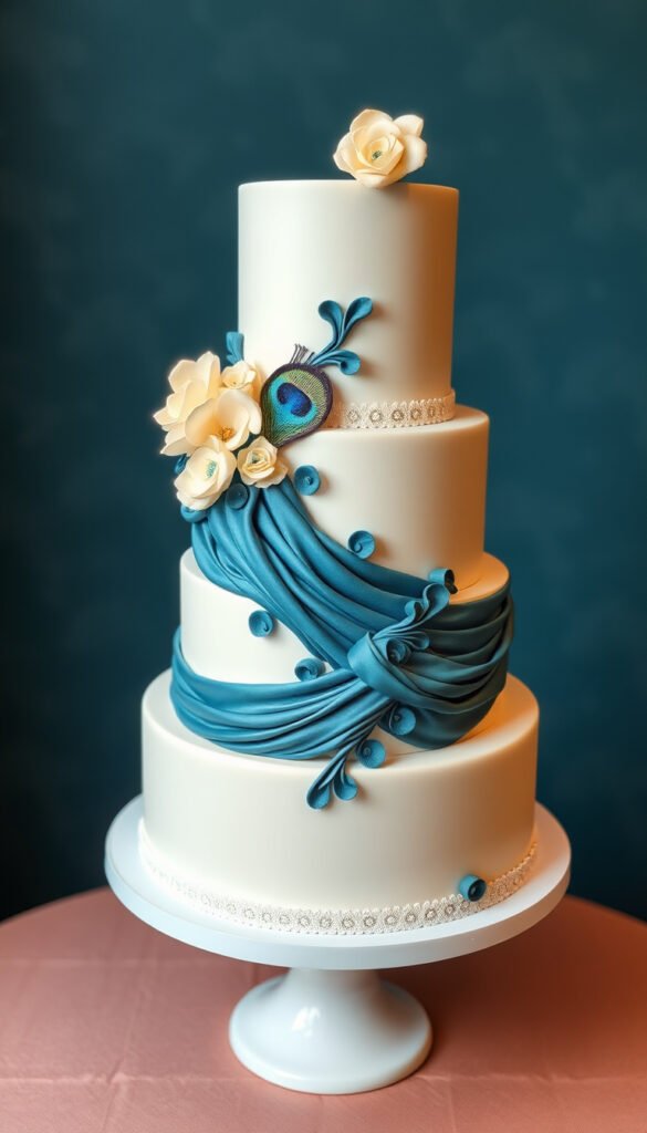 A timeless white fondant cake decorated with hand-painted peacock feathers in blue, green, and gold. Perfect for elegant indoor weddings.